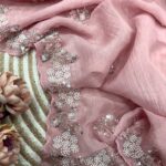 Women’s Soft Pink Organza Saree with Delicate Pearl & Sequin Floral Embroidery – Lightweight Sheer Drape for Festive, Wedding & Party Wear